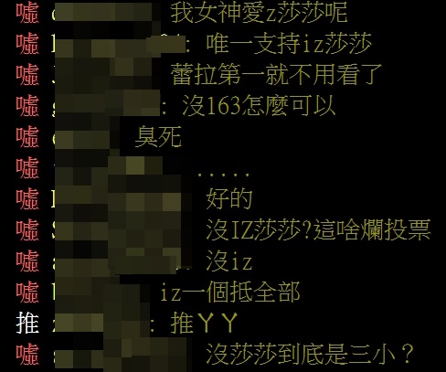 鄉民們見到排行中沒有女神「愛莉莎莎」,立刻紛紛抱不平,「沒愛莉莎莎給噓」、「我女神愛z莎莎呢」、「沒IZ莎莎?這啥爛投票」、「沒莎莎到底是三小?」、「我婆莎莎呢」、「iz一個抵全部」、「沒愛莉莎莎是在自high?」。