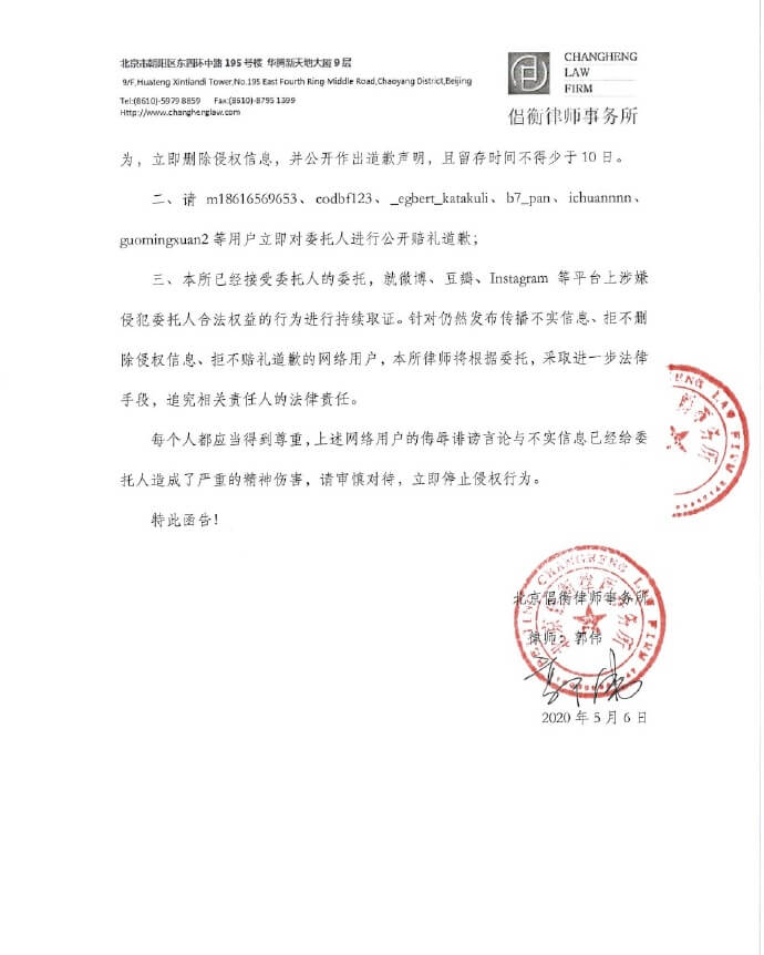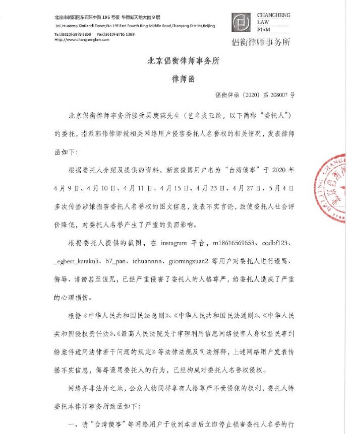 在聲明中可以清楚看到,點名了數個微博帳號在4月時曾多次損害炎亞綸名譽、發表不實的言論,害得炎亞綸的社會評價降低,名譽漸漸產生負面的影響!此聲明中也要求那些被點名的網友公開道歉,「誹謗言論跟不實訊息已經對委託人造成精神傷害」,要求相關人士停止這些行為。