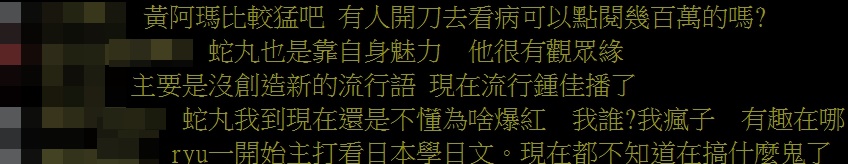 PTT文章一出,立刻掀起一陣討論話題,鄉民們紛紛留下看法表示,「黃阿瑪比較猛吧!有人開刀去看病可以點閱幾百萬的嗎?」、「ryu一開始主打看日本學日文。現在都不知道在搞什麼鬼」、「以前Youtuber比較少,題材稍微有趣就有人看了」、「知識型幾乎半路就掛了」、「從題材轉型到自身魅力真的蠻重要的」、「沒有個人特色基本上只能蹭時事」、「夾娃娃死一堆,烏鴉轉型不錯可惜被盯上」。