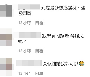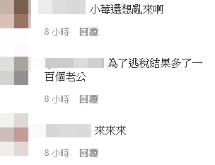 貝莉莓貼文一出,立刻引來不少粉絲留言,「不止逃漏稅,還會陪睡」、「私!」、「莓問題」、「假結婚真____」、「我今天就可以登記」、「假結婚要明年才能合併報稅」、「敢不敢來真的?」、「小莓還想亂來啊」、「為了逃稅結果多了一百個老公」、「國稅局,這裡有個知名女實況主公開說想逃漏稅」。