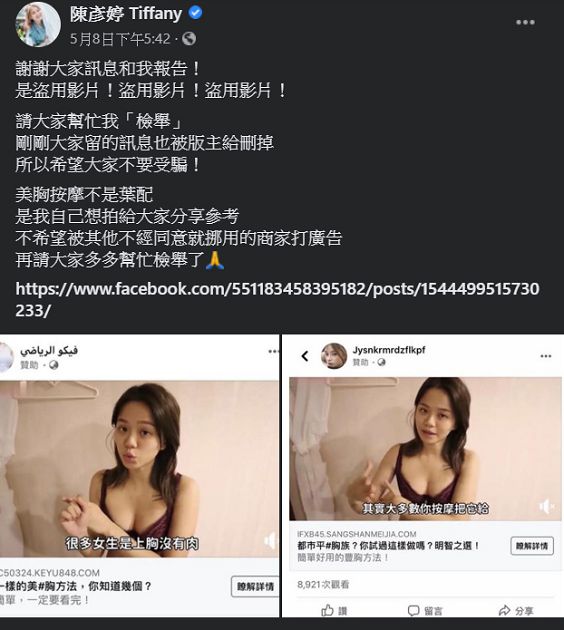 彥婷的貼文一出,立刻有不少粉絲幫忙,跑到盜用的粉專中檢舉、留言,沒想到對方竟刪除留言,而截至目前該盜用的貼文仍未被下架,因此彥婷也不斷重申「美胸按摩不是葉配,是我自己想拍給大家分享參考,不希望被其他不經同意就挪用的商家打廣告」,期盼粉絲們能多多幫忙檢舉。
