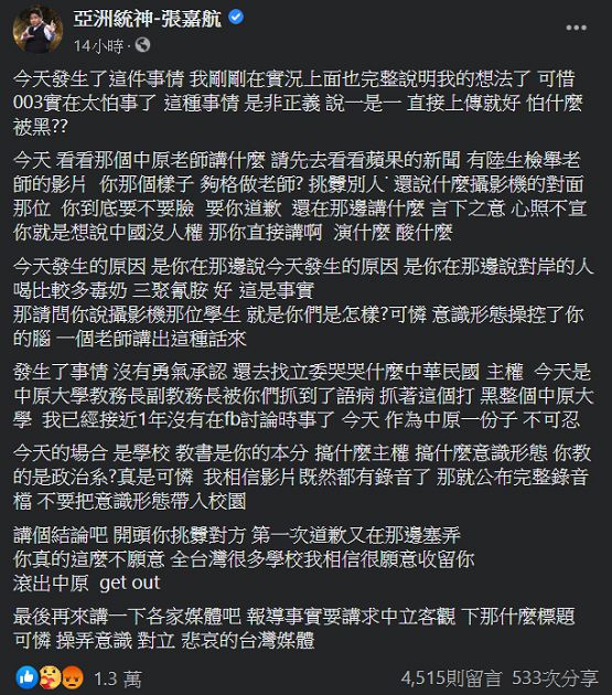 日前,中原大學生物科技系副教授招名威上課時,以「大陸同學吃毒奶粉比較多」等言論,遭到陸生投訴,校方則要求該教授在課堂公開道歉,引起社會大眾關注,該課堂的逐字稿也跟著曝光。對此,統神身為校友也忍不住開砲,直呼「你那個樣子夠格做老師」?