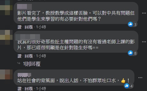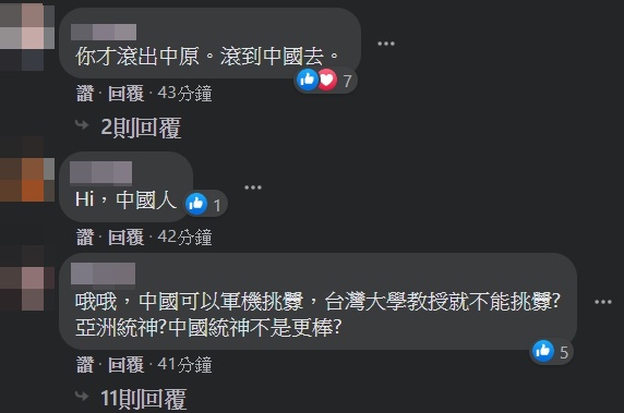 統神一番意見,瞬間引來正反兩派意見,有人認為統神偏頗中國,紛紛留言表示,「你才滾出中原。滾到中國去」、「中國可以軍機挑釁,台灣大學教授就不能挑釁?」、「中國統神」、「亞洲中國台灣地區統神-航航」。不過也有許多人贊同統神言論,認為為人師表公然帶頭霸凌本就是錯誤行為,統神逆風發言,不怕遭到出征的行為,也獲得許多粉絲讚賞。