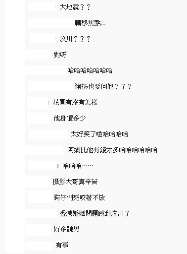 其他網友也瘋狂在留言區留言表示,「扯到汶川地震?」、「哇!感情跟地震有啥關係」、「轉移焦點嗎?」、「好好笑哦!」、「也跳太快了吧!」、「第一次看到有這樣的人!」、「他說要告到死耶!那個廣告妹慘了」。