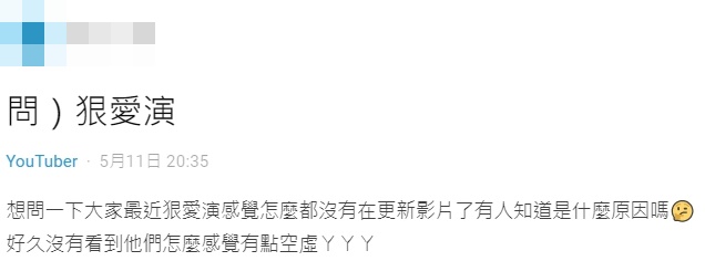 日前有網友發現,狠愛演近期更新影片速度越來越慢,甚至感覺到幾乎沒發片,讓人感到生活空虛。而從狠愛演的頻道中可以發現,上一支影片停留在4月30號,至今已有將近半個月沒有發片,和以往的速度差非常多,網友們除了在影片下紛紛敲碗新片以外,也在Dcard上掀起另一波討論。