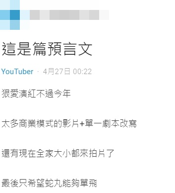 事實上,除了更新速度被提出討論以外,前陣子更有人預言「紅不過今年」,同時直接點出狠愛演太多商業模式的影片、單一劇本改寫,想撐下去讓更多人買單有難度。然而從狠愛演的頻道中也能發現,近日的觀看數和過去相比,有微幅下滑的趨勢,讓不少粉絲擔心,期盼狠愛演能盡早跳脫低潮。
