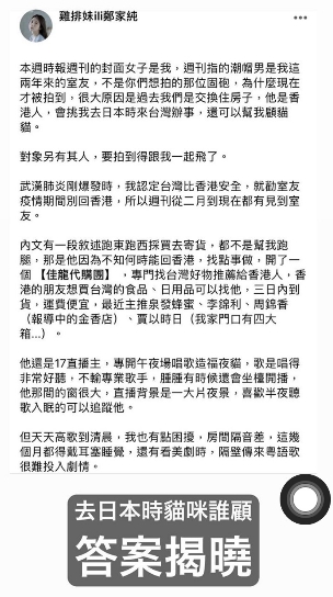 雞排妹表示,過去室友沒被拍到,其實是因為對方是香港人,會挑雞排妹不在台灣時,來到台灣辦事情,同時也幫忙照顧貓咪,近日則因疫情爆發,因此從2月開始留在台灣。而該名潮帽男,其實是17的直播主,經常在半夜唱歌造福夜貓,不過也讓雞排妹無奈表示,「天天高高到凌晨,我也有點困擾,這幾個月都得戴耳機睡覺,還有看劇時,隔壁傳來粵語歌很難投入劇情」!