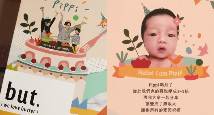 「Welcome to our family!」林宥嘉的女兒Pippi滿月,他與太太丁文琪、大兒子酷比舉起雙手,熱情歡迎Pippi到來。林宥嘉在卡片上表示:「從此我們家的喜悅變成3+1倍,再和大家一起分享,就變成了無限大!謝謝所有的愛與祝福。」也因此,他準備了位於台北民生社區神秘奶油甜點店but.(we love butter)的濃厚奶油餅乾及雙層卡士達奶油生乳捲禮盒,把他們的喜悅一同分享給親朋好友。