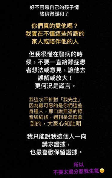 KT無奈的表示,「我實在不懂這些所謂的家人或陪伴他的人,但我很懂在發病的時候,不要一直給躁症患者想法或意見,讓他去誤解或放大!更何況是謊言。」並且強調,「這次不針對『我先生』,因為最可惡的是你們這些身邊人,那口說無憑的錄音與紙條,週刊是怎麼拿到的?大家心知肚明!我這個人一向講求證據,最喜歡保留證據,不要太過分惹我生氣!」
