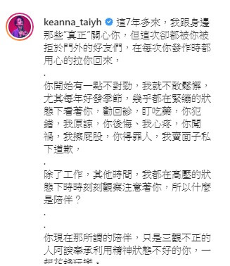 KT也在貼文內容中寫下,「抱歉,這次我沒拉回來!除了工作,其他時間,我都在高壓的狀態下時時刻刻觀察注意著你,所以什麼是陪伴?你現在那所謂的陪伴,只是三觀不正的人阿諛奉承利用精神狀態不好的你,一起花錢玩樂!現在也還是。」可以明顯感受到KT心裡的難過與無奈,但她選擇不說太多,把這些話寫進書裡。