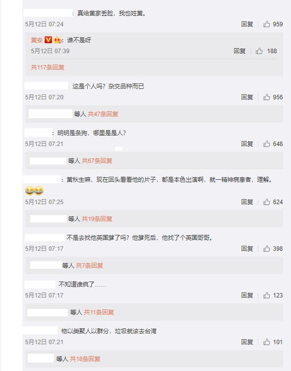 其他中國網友則是湧入黃安的微博留言表示,「這是個人嗎?他只不過是個雜交品種!」、「黃秋生嘛!現在回頭看他演的片子,都是本色出演,精神病患一個!」、「不是去找他的英國爹了嗎?」、「不知道是誰瘋了...」、「物以類聚啦!垃圾果然都在台灣」。