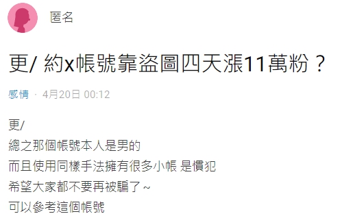 日前有網友在Dcard發文,發現某約砲帳號經常轉PO其他女生的文,更曾祭出條件,只要標記朋友就能拿私密照,藉此吸引不少人追蹤,短短幾天就擁有13萬粉絲!不過當該帳號貼出正面照時,原PO立刻發覺是盜用人圖片,因此發文提醒大家小心!