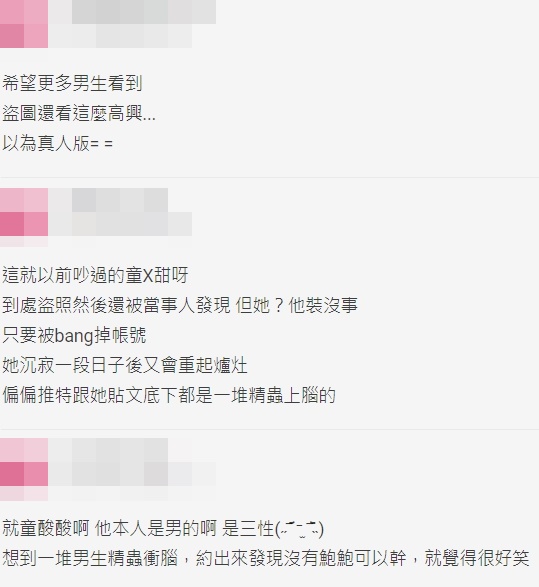 Dcard文章一出,立刻吸引廣大網友討論,不少人看出該帳號的真實身分,就是過去一樣使用盜圖手法的「童酸酸」,因此紛紛留言表示,「這就以前吵過的童X甜呀!她沉寂一段日子後又會重起爐灶」、「就童酸酸啊,他本人是男的啊!想到一堆男生精蟲衝腦,約出來發現沒有鮑鮑可以幹,就覺得很好笑」、「盜圖的還一堆精蟲高潮 」、「童酸酸的Twitter也很精彩,一堆盜照盜影片」、「噁心的是他盜圖騙人的行為,而不是他的性別認同、性傾向或性別氣質」。