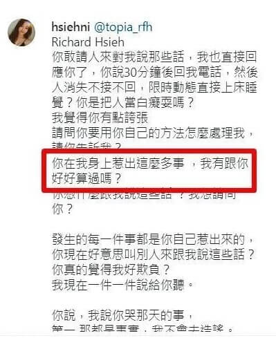 女友Ivy在王大陸接受隔離的這段時間,突然在IG上寫下長文,並Tag了一位叫做Richard Hsieh的人,她一開頭就嗆對方說,「把人當白痴耍?我覺得你有點誇張,請問你要用自己的方法怎麼處理我?請你告訴我!」還接著質問對方,「你在我身上惹出這麼多事,我有跟你好好算過?」讓人感受得到她非常憤怒。