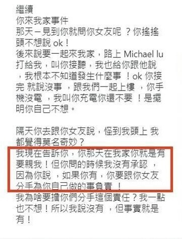 此外,Ivy在內文中也提到,「我現在告訴你,你那天在我家你就是有要親我!但你問的時候我沒有承認,因為你說,如果你有,你要跟你女友分手,味你自己做的事情負責!」讓她覺得非常莫名其妙,「我為啥要擔你們分手這個責任?一點也不想!所以我才說沒有,但事實就是有!」