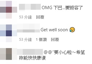 咪妃貼文一出,立刻嚇壞不少網友,粉絲們也紛紛湧入留言關心,「媽啊!要好好顧傷口我的天」、「天啊!好好休息」、「小咪要好好休息」、「早日康復」、「注意安全,早日康復」、「希望能早日好起來」、「注意安全啊 太嚴重了吧!」、「OMG 下巴...要毁容了」。