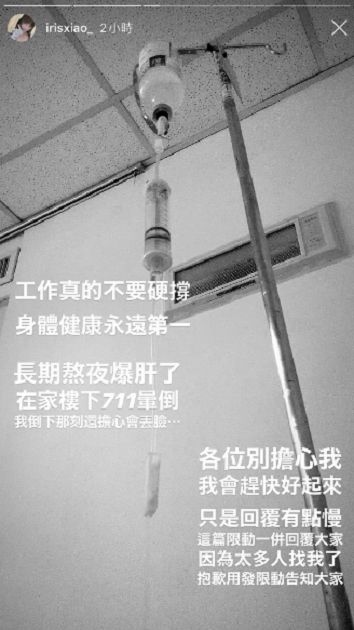 閃亮亮近期開創個人頻道,扛下一個頻道的所有事,讓她十分忙碌,也因此長期熬夜,沒想到身體卻亮起紅燈!閃亮亮日前在限時動態中,曬出一張「點滴照」,同時透露自己因為長期熬夜的關係,在便利商店昏倒,送醫檢查後,發現自己的肝指數竟飆高三倍!