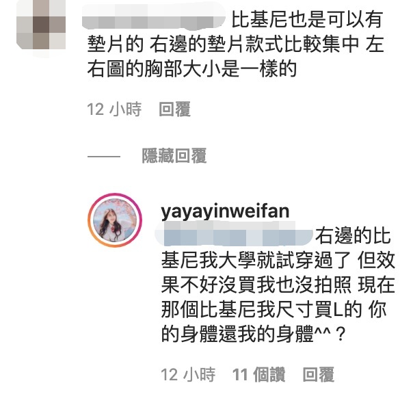 丫丫照片一出,暴風式的成長也引來不少人質疑做假,丫丫則大方表示,如果要動刀隆乳的話,絕對不會只有現在這樣的大小!另外,也有人懷疑對比照片當中,比基尼的款式不一樣,無法比較,質疑其實只是黃色比基尼比較集中,才會有這樣的效果,對此丫丫則回覆,「右邊的比基尼我大學就試穿過,但效果不好沒買我也沒拍照,現在那個比基尼我尺寸買L的, 你的身體還我的身體^^?」。