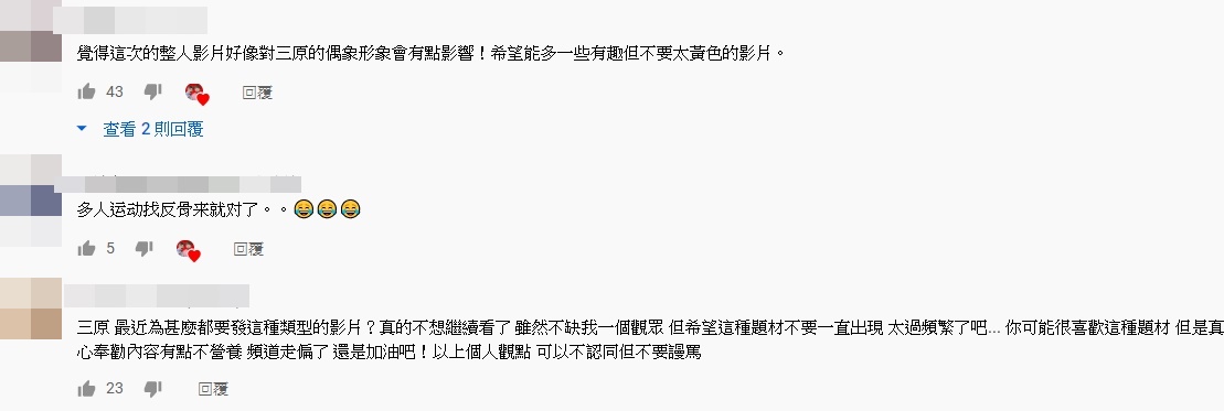 三原影片一出,雖然笑翻不少人,不過也有粉絲們認為,三原頻道近期應該注意黃標尺度,紛紛留言表示,「比較喜歡以前拍的比較正面,最近拍的有點黃」、「三原以前所有的片都有看,很喜歡,可惜最近偏黃了」、「感覺頻道風格整個走偏了」、「三原最近怎了都發這種片」、「覺得這次的整人影片好像對三原的偶象形象會有點影響!希望能多一些有趣但不要太黃色的影片」。