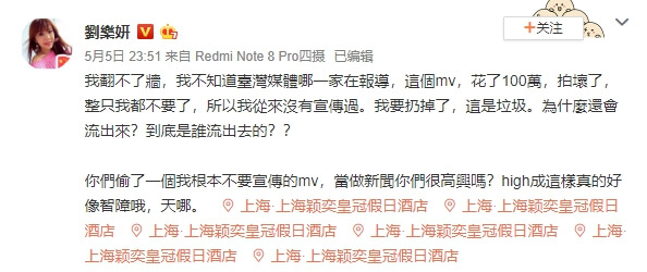 日前,歌手劉樂妍斥支百萬打造的愛國單曲《CHINA》意外曝光後,因倒讚數連夜破萬登上媒體版面,而隨著劉樂妍本人在微博發文認MV不如預期:「我要扔掉了,這是垃圾!為什麼還會流出來?到底是誰流出去的?」以及原影片正式下架後,話題討論度也逐漸降溫。不料本月15日,知名脫口秀演員博恩於頻道上架一支拍攝手法高度還原、嘲諷度滿點的單曲《TAIWAN》,並在24小時內登上Youtube發燒影片榜首後,《CHINA》MV再重掀討論熱度。