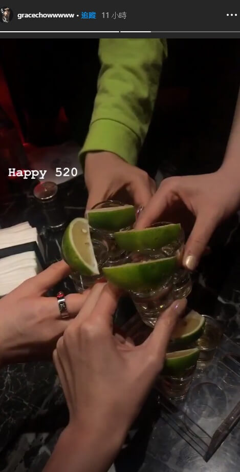 周揚青在社群平台上更新限時動態,貼出了在酒吧裡的照片,從畫面中可以看到,有一包點滴掛在桿子上,接著下一張是4個人拿著酒杯撞杯的畫面,讓大家知道她人在酒吧,一點都不孤單,而且還寫下「Happy 520」,感覺心情非常好!相比羅志祥在20日早上9點12分發文之後她的「早安」貼文,晚上的心情感受得到好了很多!