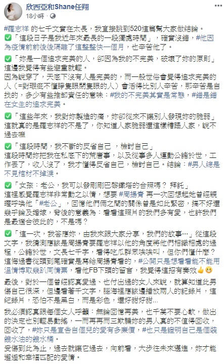 欣西亞認真地看了羅志祥的長文之後,認為這篇貼文實在是太長,所以她直接跳到520那篇,給大家做了精闢的解析,並對網友們說,「你們懂什麼?這懺悔書從頭到尾都是給周揚青看的,公開只是想看看有沒有辦法博取同情票,但看他FB下面的留言,看來是有奏效!」,也有提到這悔過書會喚醒周揚青的甜蜜回憶。