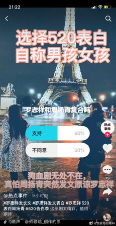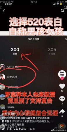 藝人羅志祥在520當天在臉書、微博貼出了長篇懺悔文,一方面跟周揚青道歉,另一方面則是細數兩人交往期間的各種點滴,讓不少人都質疑,小豬發這文根本就是想挽回周揚青,結果在抖音的粉絲團投票活動中,有網友問到「羅志祥跟周揚青復合嗎?」結果小豬竟用自己的帳號投票,引起高度關注!