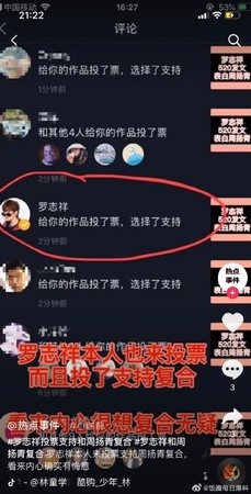 在抖音的粉絲團上面,有網友舉辦了一個投票活動,問大家「羅志祥和周揚青復合嗎?」結果後來被發現羅志祥本人有用自己的帳號去投票,讓粉絲團馬上發文說,「羅志祥也投票了!一會出視頻!」並釋出了一段抖音影片,裡頭有多張截圖,證明來投票的小豬帳號是有著官方認證的黃勾勾帳號!