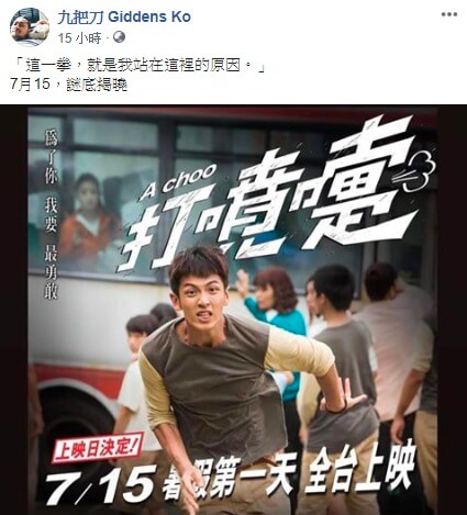 作家九把刀有許多作品都被翻拍成電影,其中《打噴嚏》本來是要在2014年就上映,但是剛好當時柯震東爆發了大麻事件,又加上中國出品方要求要中國先上映,讓電影沒辦法在台灣上映!他後來有在臉書跟大家說自己已經買回了版權,只是又剛好碰上武漢肺炎,讓電影上映的時間不斷的被延期,直到21日他終於公布好消息,「這一拳,就是我站在這裡的原因!7月15日,謎底揭曉!」