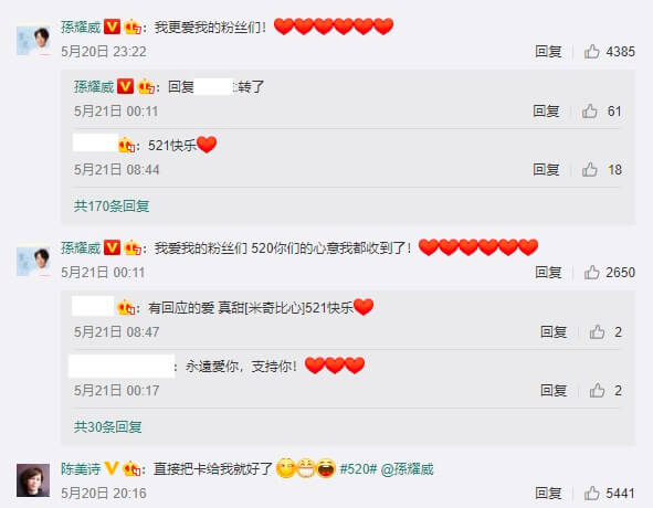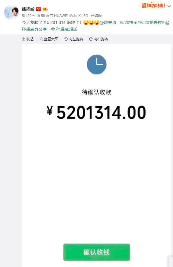 孫耀威20日在微博發文分享了截圖,並在貼文內容中寫道,「今天我轉了5201314給她了!」還不忘Hashtag「520」,讓不少網友都看到他轉了一大筆錢給他的老婆,所有人傻眼到不行,紛紛留言表示,「我們最高單日只能20萬耶!為什麼你的金額可以這麼高?」、「這個恩愛秀的我們羨慕忌妒啊!」、「這數字真的太誇張!」、「要變成男性的公敵了」、「要一直幸福下去啊!」。