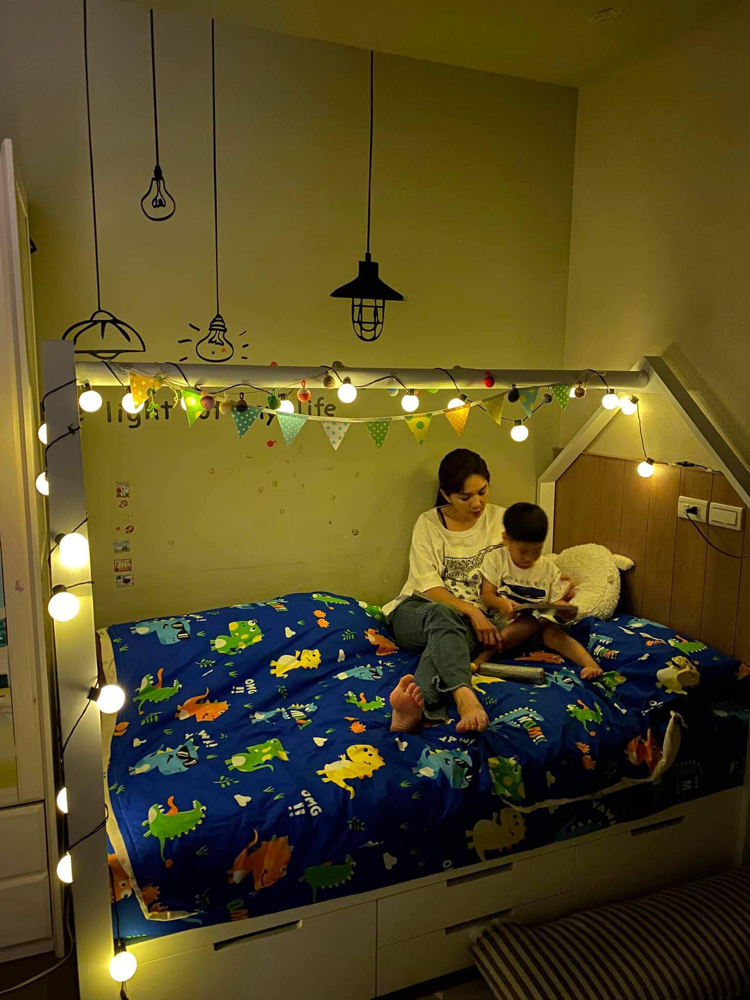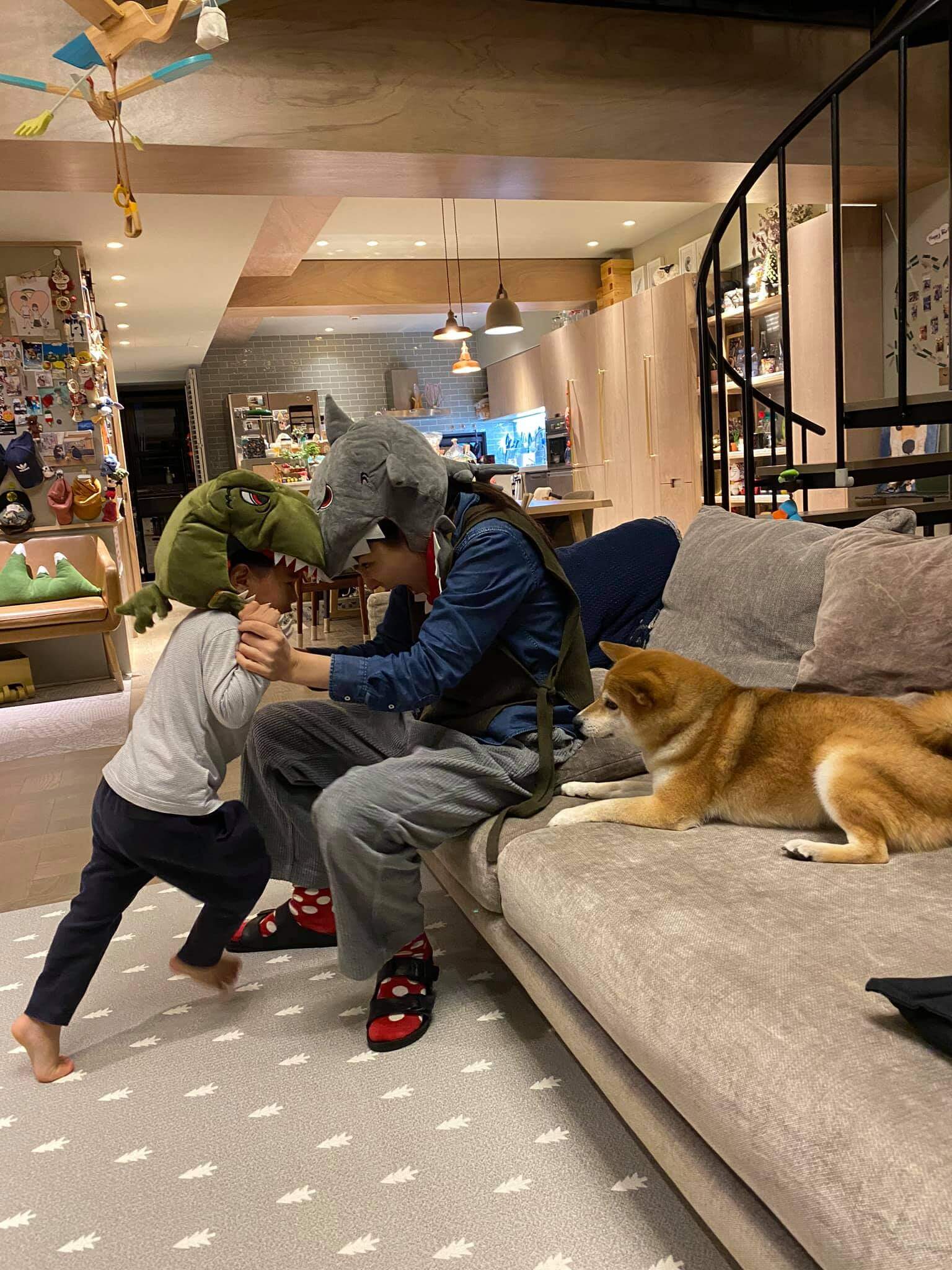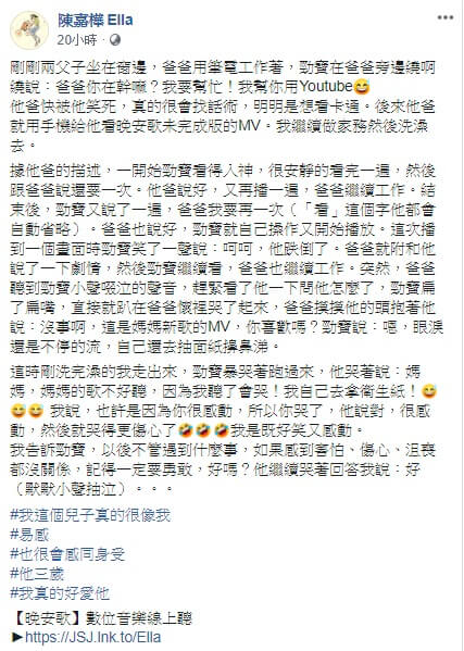 Ella最近在臉書發文曬出自已跟孩子在家裡玩耍的照片,並在貼文內容中寫道,「爸爸用筆電在工作,勁寶在旁邊繞啊繞的,說要幫爸爸用Youtube,讓他爸快笑死,明明就是想看卡通!後來他爸用手機給他看《晚安歌》未完成版的MV,我繼續做家務然後洗澡去~」