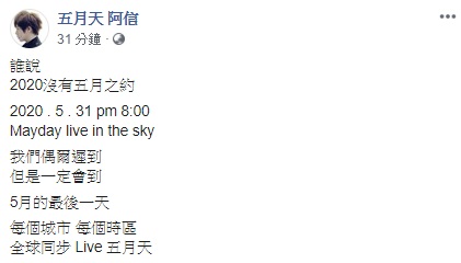 不過,寵愛粉絲的他們當然也不會讓粉絲失望,阿信也在臉書上正式宣布,即將在5月31日晚上8點,舉辦「五月天Mayday 突然好想見到你」線上演唱會,並且在貼文內容中寫道,「誰說2020沒有五月之約,2020.5.31 pm8:00 Mayday live in the sky,我們偶爾遲到,但是一定會到!5月的最後一天,每個城市、每個時區,全球同步Live五月天」,正式宣告要履行跟大家的約!