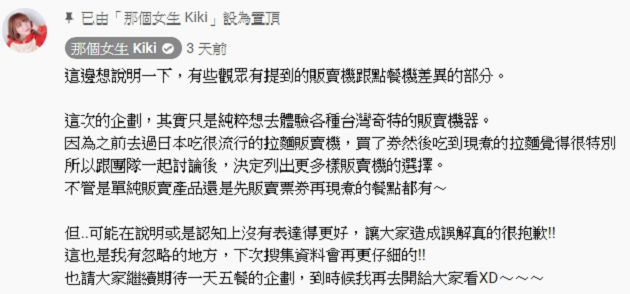 引起一陣論戰後,KiKi也現身作出解釋,「之前去過日本吃很流行的拉麵販賣機,買了券然後吃到現煮的拉麵覺得很特別,所以跟團隊一起討論後,決定列出更多樣販賣機的選擇。」對於說明、認知上沒有表達好造成誤解,Kiki感到非常抱歉,未來拍攝影片、蒐集資料會更仔細小心。