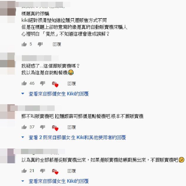 不少網友看完影片後,紛紛留言開轟,「標題真的很騙,kiki絕對很清楚知道拉麵只是販售方式不同,但是在標題上卻故意寫的像是真的自動販賣機來騙」、「這算販賣機嗎?我以為這是自助點餐機」、「如果是販賣機結帳廚房出來,不算販賣機吧」、「這標題真的很母湯」、「直接退出不看,標準的圖文不符啊!」。