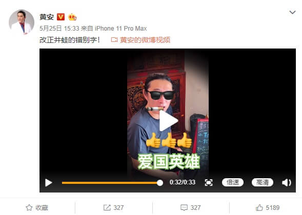資深藝人黃安前陣子因為受到武漢肺炎的影響,目前只能乖乖待在台灣,並沒有像劉樂妍急著跑回去中國,不過他依然會在微博上發表自己對於時事的看法與意見!像是最近他外出吃飯,看到有店家在門口放了一個黑板寫著「武漢肺炎」四個字,讓他氣得直接拿筆自己修改成「新冠肺炎」,還拍成影片說自己是在「修改井蛙的錯別字」,引起熱議!