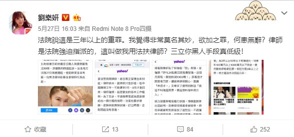 劉樂妍27日在微博發文氣噗噗的寫道,「法院說這是三年以上的重罪,我覺得非常莫名其妙,欲加之罪,何患無辭?律師是法院強迫指派的,這叫做我用法扶律師?」讓她氣到不行,發文宣洩情緒。