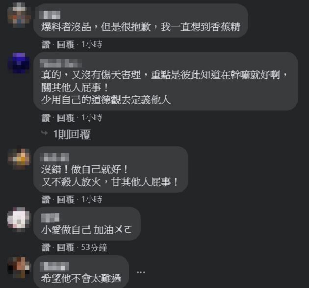 黃小愛的貼文一出,立刻被網友們讚爆,同時也紛紛留言表示,「爆料者沒品」、「又沒有傷天害理,重點是彼此知道在幹嘛就好啊,關其他人屁事!」、「又不殺人放火,甘其他人屁事!」、「希望他不會太難過」、「注意安全就好」、「這麼私密的事,爆料的很沒品」、「公眾人物也是人,也會有七情六慾,約炮也很正常」、「約炮又怎麼了?單身有自由吧!」。