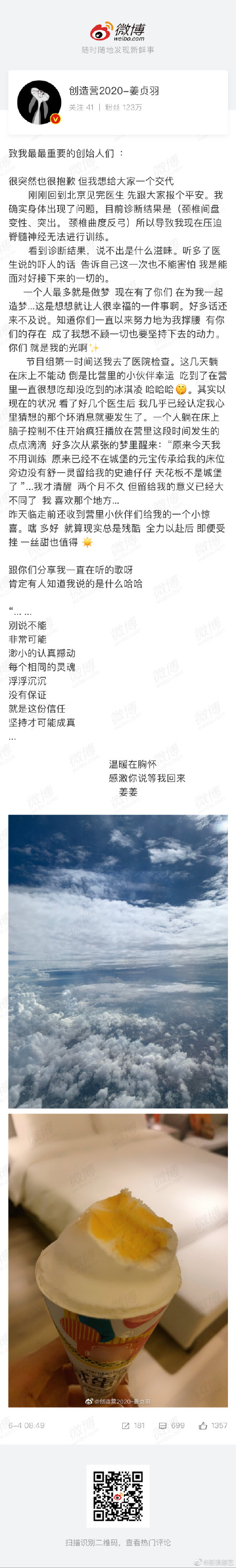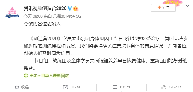 不過日前姜貞羽卻爆出舊傷復發暫時退出節目,有網友曝光她在機場的照片,戴著墨鏡的姜貞羽脖子上戴著固定器,看似傷勢不輕。《創造營2020》官方微博也證實:「《創造營2020》學員姜貞羽因身體原因於今日飛往北京接受治療,暫時無法參加近期的訓練課程和表演。」並透露會隨時關注她的身體恢復情況,並向創始人們回報。