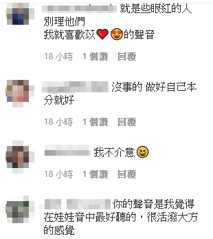 巫苡萱貼文一出,立刻獲得不少粉絲讚賞,紛紛留言表示,「妳的聲音真的不行,聽久了會戀愛」、「多羨慕你的聲音」、「你的聲音是我覺得在娃娃音中最好聽的,很活潑大方的感覺」、「做自己就好」、「覺得你的聲音很好聽而且羨慕」、「聲音很好聽啊?怎麼了」、「你的聲音很可苡,做自己就好」。