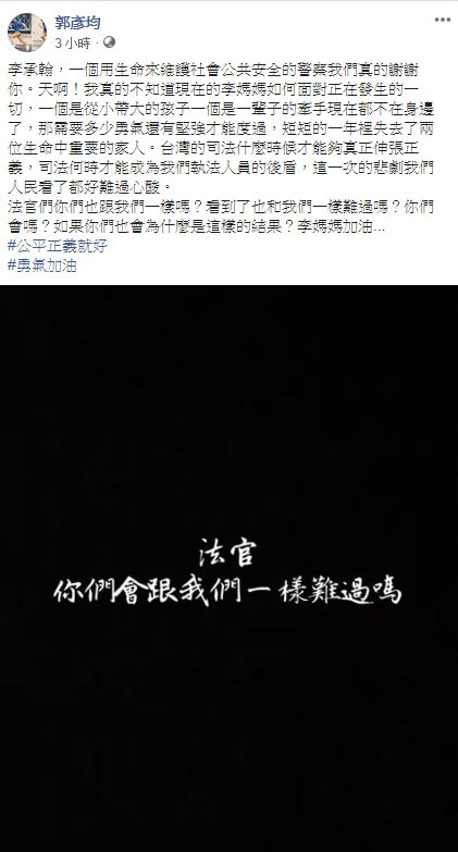 郭彥均也非常難過的說,「台灣司法何時才可以真正的伸張正義?何時才可以成為執法人員的後盾?這次的悲劇讓人民看了都好難過好心酸...法官你們看到了也會跟我們一樣難過嗎?如果會的話,為什麼是這樣的結果?」還不忘跟李媽媽喊話「加油!」