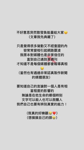 發文後沒多久,李優決定將負能量文章典藏,盼能帶給大家樂觀的一面,「文字可以殺人也可以救贖人,我們自己也要有辨別真實的能力!」李優貼文一出,引來不少粉絲心疼表示,「勇敢的妳一定會越走越順遂的,加油!」、「說出事實不需要不好意思,正能量本就伴隨著負能量」、「留給需要你的人時間,至於非善意的不實就請略過吧」。