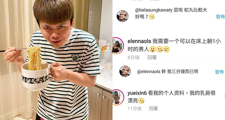 近日蔡阿嘎於社群平台中,曬出一張留言對話截圖,這兩天他的IG中來了不少「忠實觀眾」,因此他決定陪聊一下!從中可以看到,連續三個留言都和「性」有關,包含「我的身體和乳房很大,你想先握住哪一部分,然後對接還是其他?」、「我需要一個可以在床上躺1小時的男人」、「看我的個人資料,我的乳房很漂亮」,而蔡阿嘎也幽默對答,其中更不忘自嘲「我三分鐘而已啊!」、「蛇丸比較大」,同時也大讚還是二伯最漂亮!