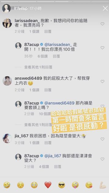 事實上,近期許多網紅、藝人等IG都被「乳房機器人」進攻,包括「白癡公主」、「愛莉莎莎」等人,大家也十分熱情地跟機器人們聊天,雖然煩人,但是機器人們總是第一時間來報到,讓白癡公主也開玩笑表示,「很感動」。