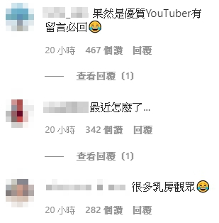 貼文一出,立刻引來不少網友留言,「然是優質YouTuber有留言必回」、「很多乳房觀眾」、「結果這篇文章底下出現更多乳房機器人了」、「二伯表示:你識貨」、「一堆突然莫名奇妙的詭異帳號」、「如果留言有盈利!阿嘎絕對賺翻」、「超懂回哈哈哈」、「阿嘎的新身份:陪聊服務」。