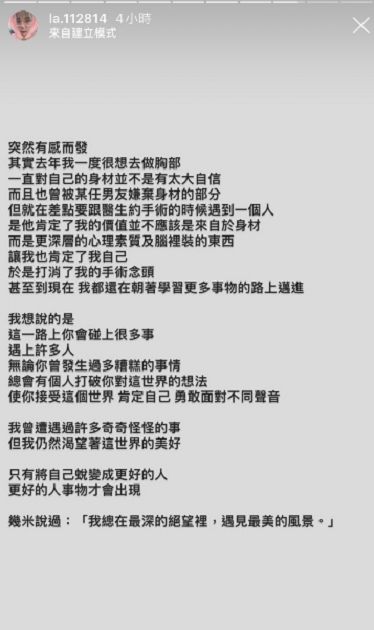 蕾菈近日發布限時動態,表示自己在去年時,曾經一度動過「做胸部」的念頭,對自己的身材沒有自信,更曾被某任男友嫌棄身材,所幸在她決定要約手術的時候,遇到一個貴人,對方肯定蕾菈的價值不應該是來自身材,而是心理、內涵等,終於讓蕾菈肯定了自我,最後打消了手術念頭。