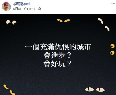 罷韓活動在6日以93萬的票數,成功罷免了高雄市長韓國瑜,讓各界都議論紛紛,而李明依也在臉書發文寫道,「一個充滿仇恨的城市,會進步?會好玩?」被網友們認為她是在對罷韓事件發表意見,大家便紛紛湧入貼文底下留言說,「那你就來支持台獨不就不會仇恨了」、「你在這引戰不也是仇恨製造機」、「製造仇恨的就是今天被罷免掉的啊」。