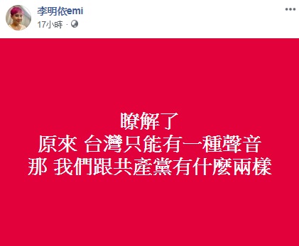 沒想到,李明依之後又發了一篇貼文寫著,「原來,台灣只能有一種聲音,那我們跟共產黨有什麼兩樣?」讓其他網友們看完都紛紛留言表示,「不要亂下結論好嗎?自己站不住腳,辯論失敗就把結論導向台灣只能容得下一種聲音?真是夠了」、「所以到底還是承認了是講高雄市嘛」、「共產黨早就讓你的發文活不到五分鐘了」、「我聽到玻璃碎裂的聲音」、「底圖好紅欸,好像真的看不出有什麼兩樣」、「老人該退休就乖乖退休」。