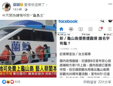 榮登免費登龜山島第一人!蔡閨曬本名「蔡蠵龜」 霸氣PO文:請叫我龜島主!