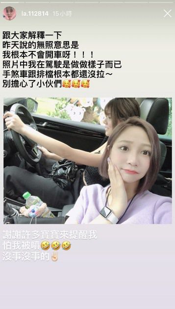 隨後蕾菈也再度貼出照片解釋,無照的意思就是她不會開車,照片也只是坐在駕駛座做做樣子而已,「手煞車跟排檔根本都還沒拉~別擔心了小伙們」!最後蕾拉也謝謝粉絲們,因擔心她沒有解釋清楚會被噴,而紛紛私訊告知。