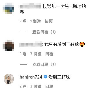 香菱貼文一出,立刻引來上萬人按讚,同時也有粉絲們紛紛留言,「讓人很走心的屁股」、「我看成三顆球」、「校隊都一次托三顆球的嗎」、「我只有看到三顆球」、「妳怎麼拿三顆球比賽,犯規唷」、「女排出美女,所言不假」、「帶太多球犯規」、「自己帶球的那種嗎」、「好不是籃球,會被吹犯規」。